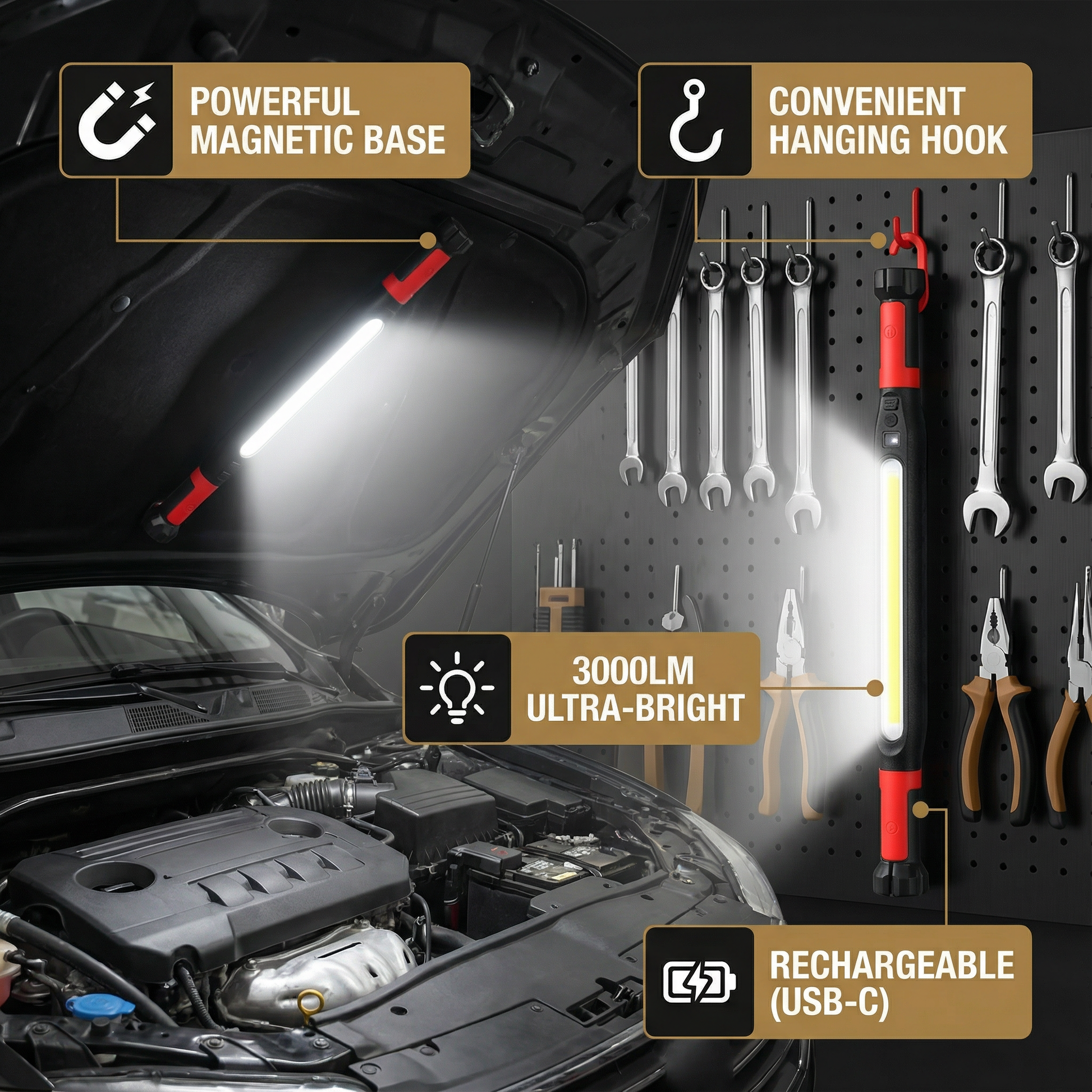 LED Work Light 3000LM – Rechargeable, Magnetic Base & Hanging Hook